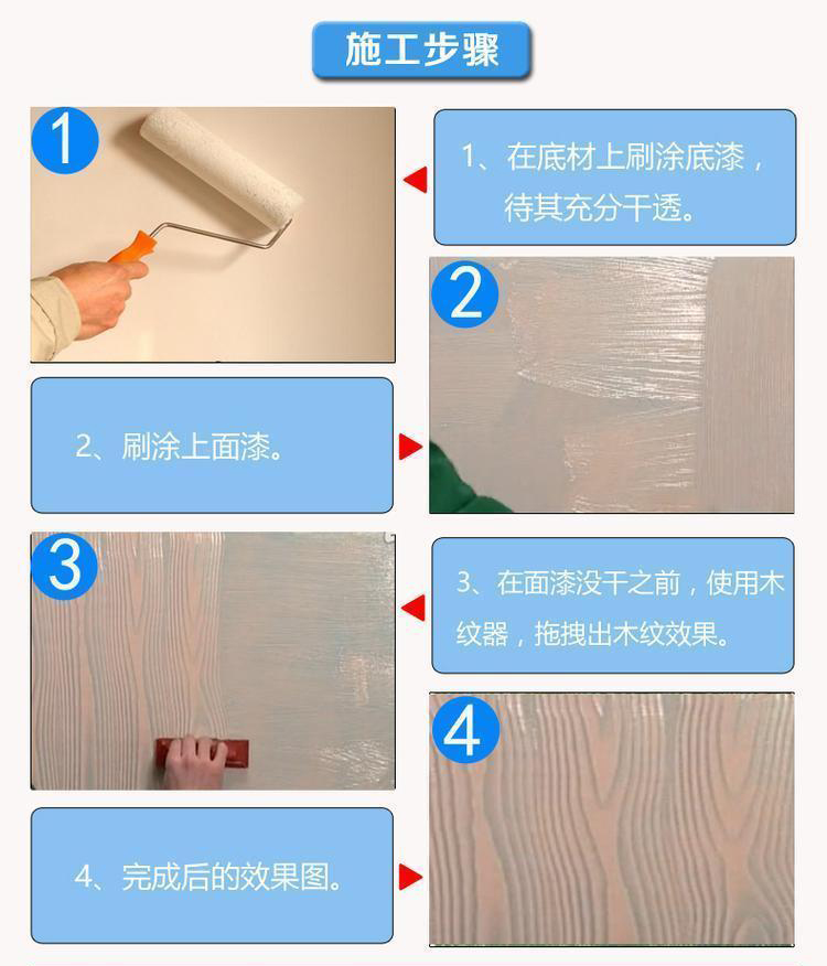 4、可呈現(xiàn)各種木紋狀藝術(shù)圖案,圖案隨意、細(xì)膩、無(wú)接縫、不起皮、不開(kāi)裂,底色和面色可以自由搭配,圖案可任意創(chuàng)作。古色古香,壽命長(zhǎng);